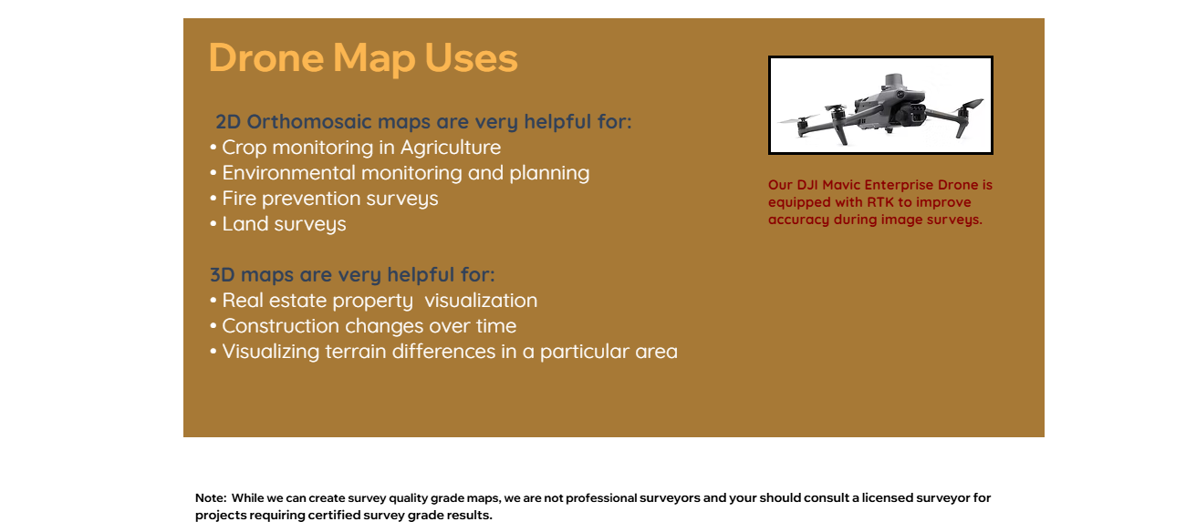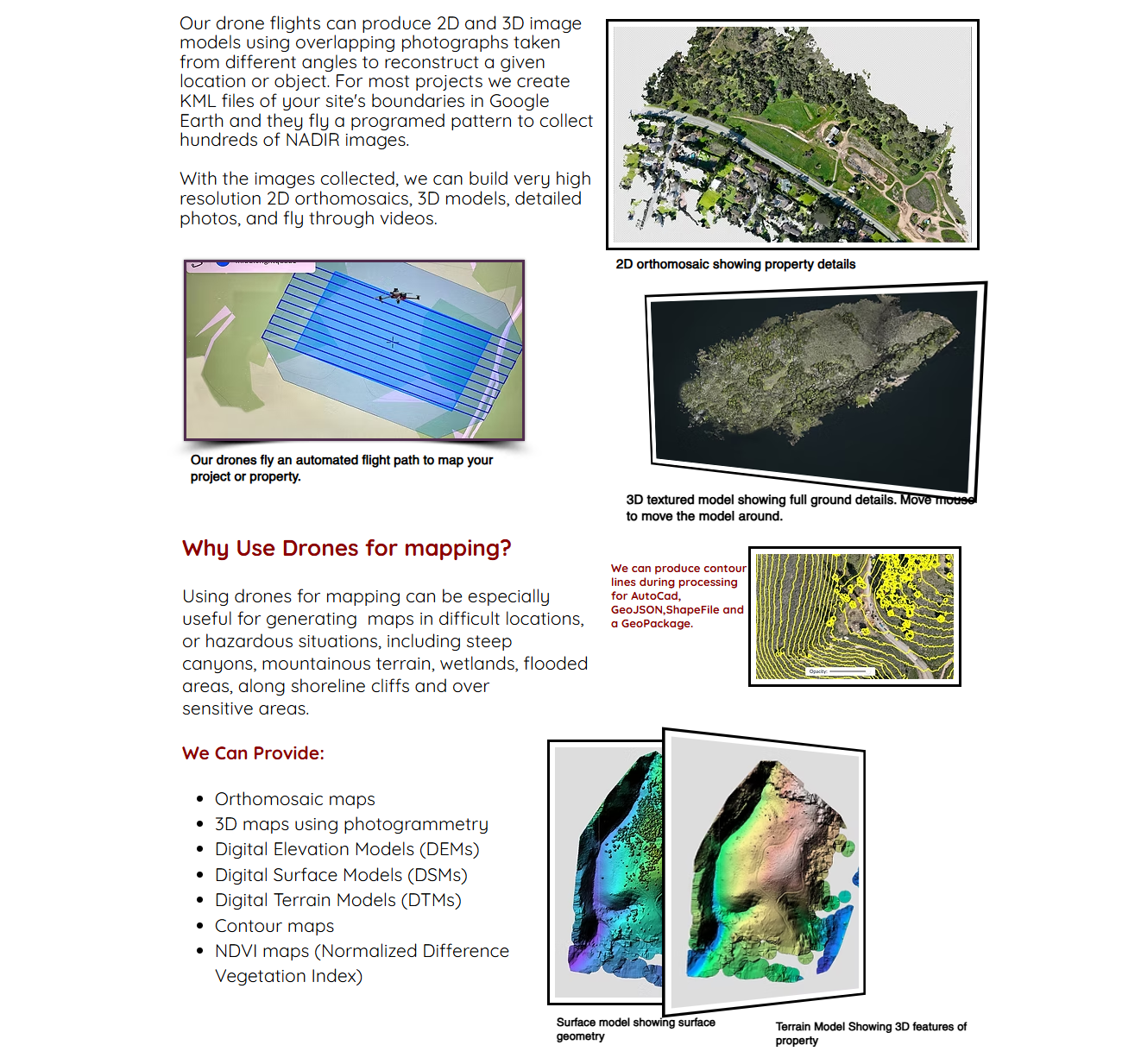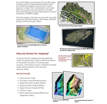 We can work with any licensed surveyor to provide highly accurate details and superior resolution. We can produce data to generate point point cloud files allowing for the creation of 3D models, maps with contour lines and a host of other outputs.